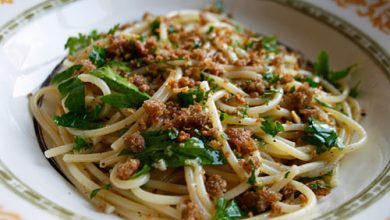 السباغيتى مع الثوم والفلفل الحار والليمون وكرسبى فتات الخبز